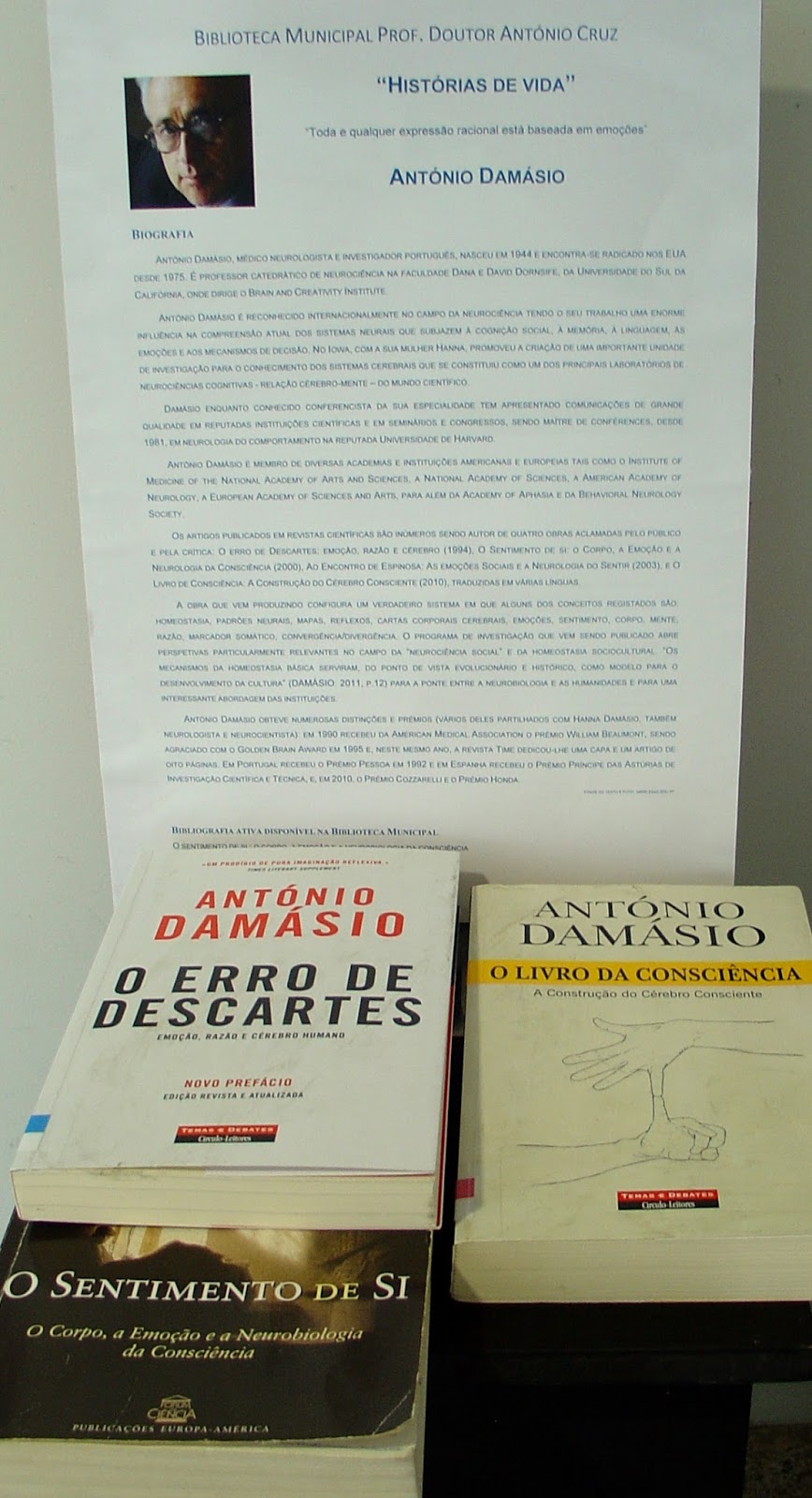 A Biblioteca Municipal Prof. Doutor António Cruz apresenta esta iniciativa de divulgação das obras que integram o seu fundo documental. “Histórias de vida” é uma mostra bibliográfica que, quinzenalmente, destaca personalidades com relevância em Portugal e no mundo. Conheça a biografia de António Damásio, até ao dia 31 de agosto.