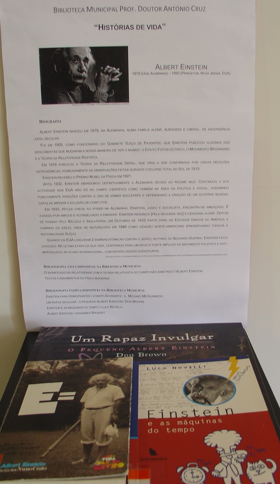 A Biblioteca Municipal Prof. Doutor António Cruz apresenta esta iniciativa de divulgação das obras que integram o seu fundo documental. “Histórias de vida” é uma mostra bibliográfica que, quinzenalmente, destaca personalidades com relevância em Portugal e no mundo. Conheça a biografia de Albert Einstein, até ao dia 15 de julho.