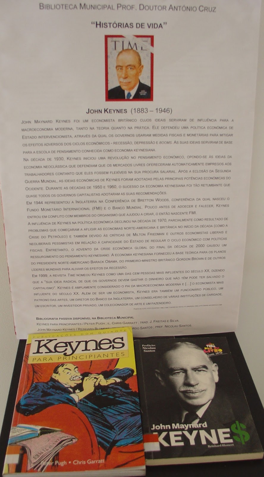 A Biblioteca Municipal Prof. Doutor António Cruz apresenta esta iniciativa de divulgação das obras que integram o seu fundo documental. “Histórias de vida” é uma mostra bibliográfica que, quinzenalmente, destaca personalidades com relevância em Portugal e no mundo. Conheça a biografia de John Keynes, até ao dia 30 de Setembro.